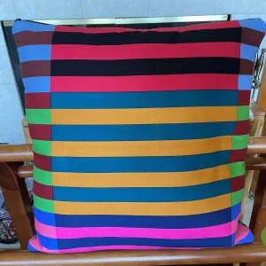 This pillow cover is made of African Print Fabrics. The Shamash & Sons Designer Cotton Fabric on the front is backed by a Designer a black and white striped fabric. The pillow cover is lined with a matching solid color Kona cotton fabric and has a color coordinated zipper.
